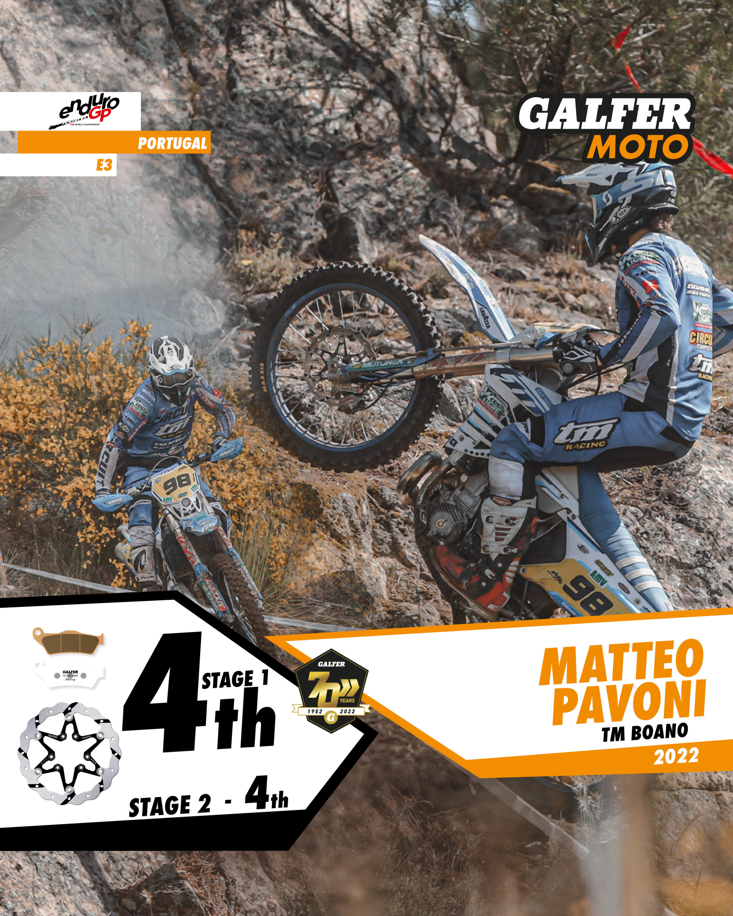 In the E1 category, Italian Matteo Cavallo (#25) took third and fourth place, also with TM Racing, while Belgian Antoine Magain (#71) took fourth and fifth place in Portugal with Sherco.
